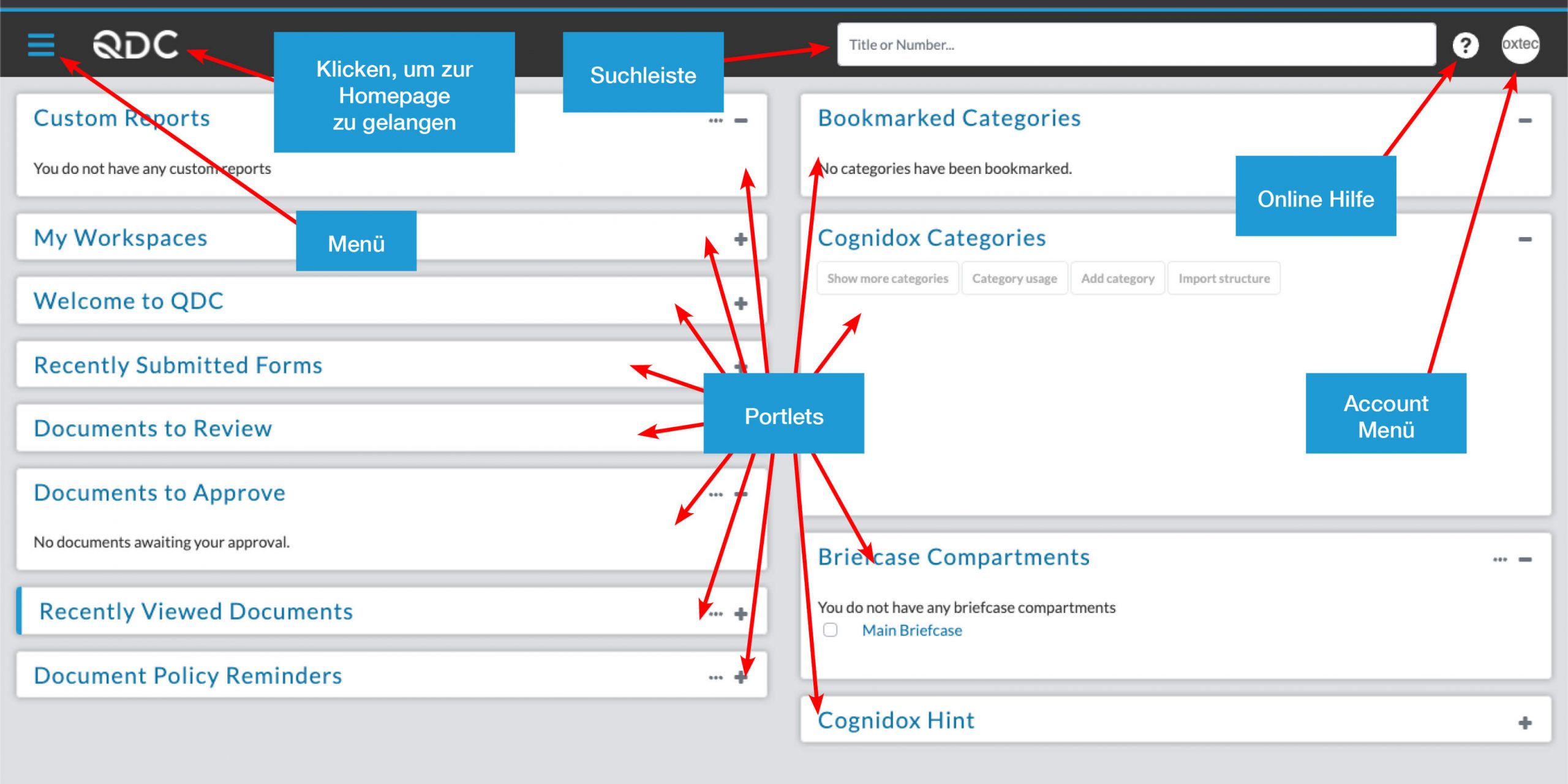 • Portlets: Diese Homepage-Panels sind Ihr Dashboard – ein personalisierter Blick auf die QDC eQMS-Dokumentenstruktur Ihres Unternehmens
