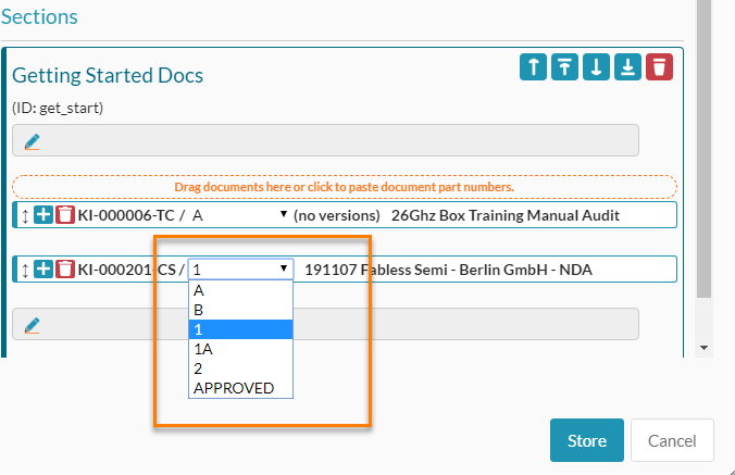 Wenn Sie ein Dokument in einen Abschnitt (section) einfügen (siehe die Methoden weiter oben in diesem Beitrag), können Sie in einem Dropdown-Menü auswählen, welche Version des Dokuments Sie verwenden möchten. Das Menü listet alle Versionen (Entwurf und Ausgabe (Draft and Issue)) auf, die das QDC eQMS im Laufe der Zeit dieses Dokuments hinzugefügt wurden.