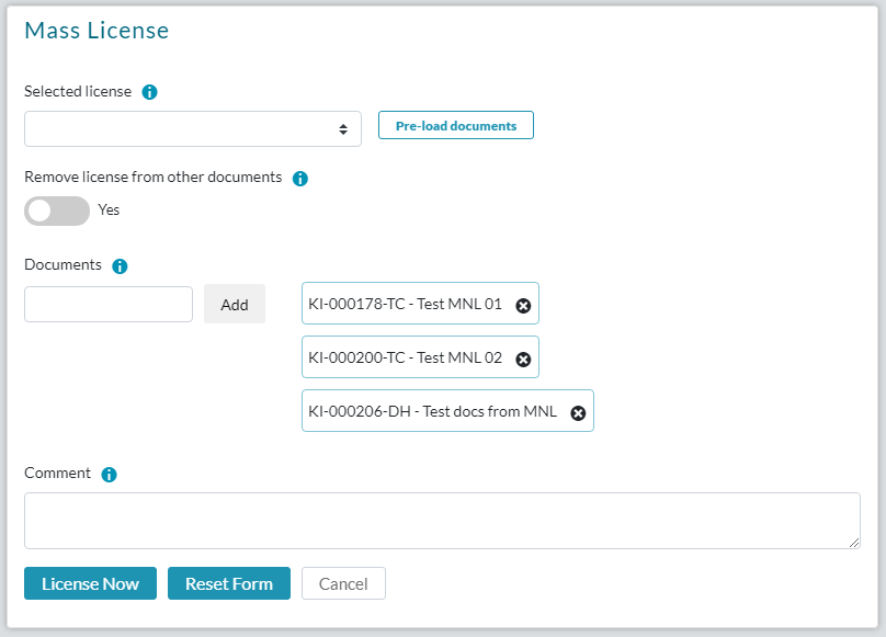 Die ausgewählte Lizenz wird hinzugefügt, wenn diese Option aktiviert ist, aber alle anderen Lizenzen, die den Dokumenten zugewiesen sind, werden entfernt. Standardmässig ist der Prozess der Massenlizenzierung additiv, d.h. die ausgewählte Lizenz wird zu den Lizenzen hinzugefügt, die den ausgewählten Dokumenten zugewiesen sind. Wenn Sie diese Option aktivieren, wird der additive Prozess gestoppt.